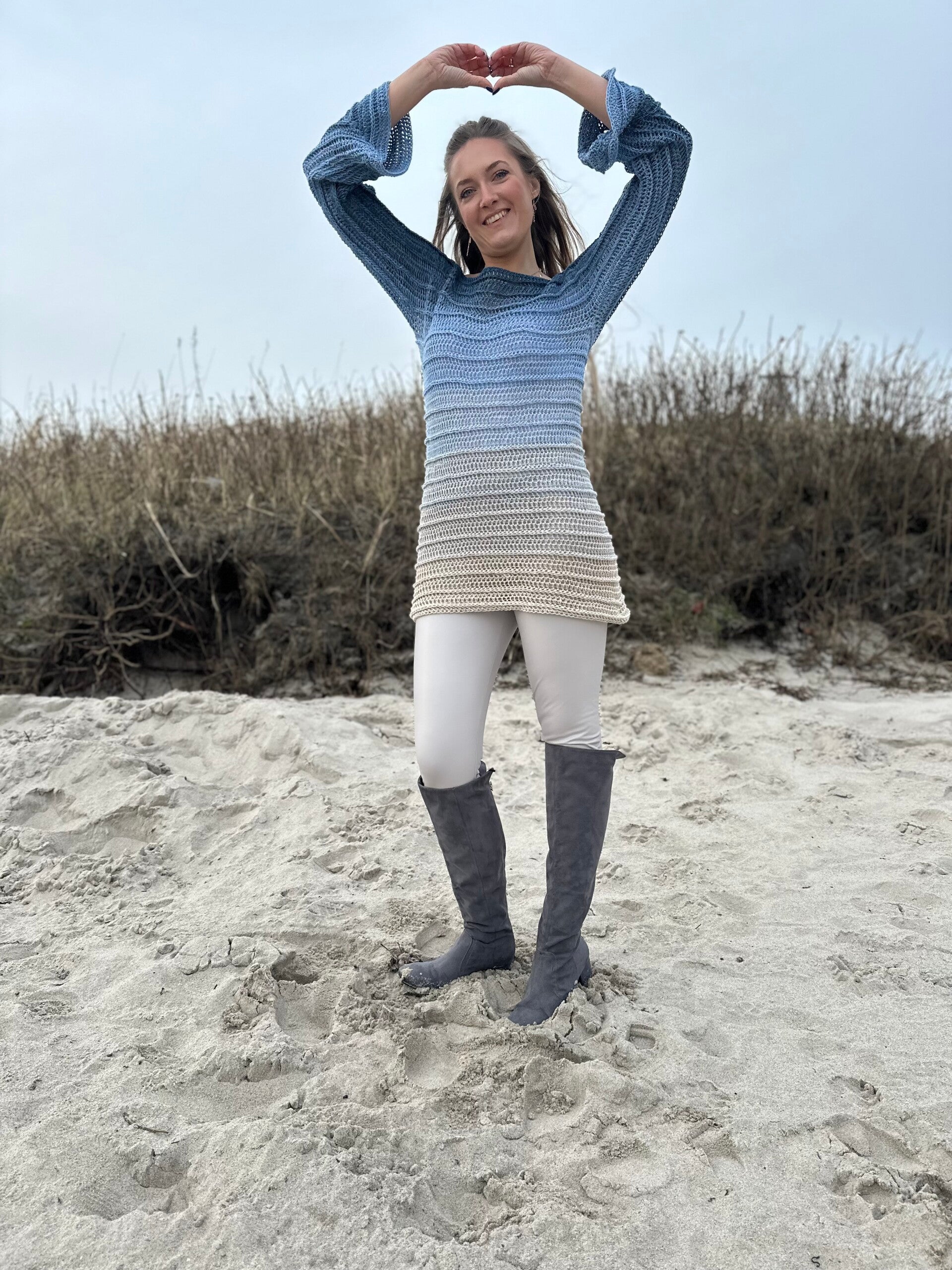 - besonders gut eignen sich hier Farbverlaufsgarne, weil der Pulli mit einem Rutsch von der Häkelnadel hüpft