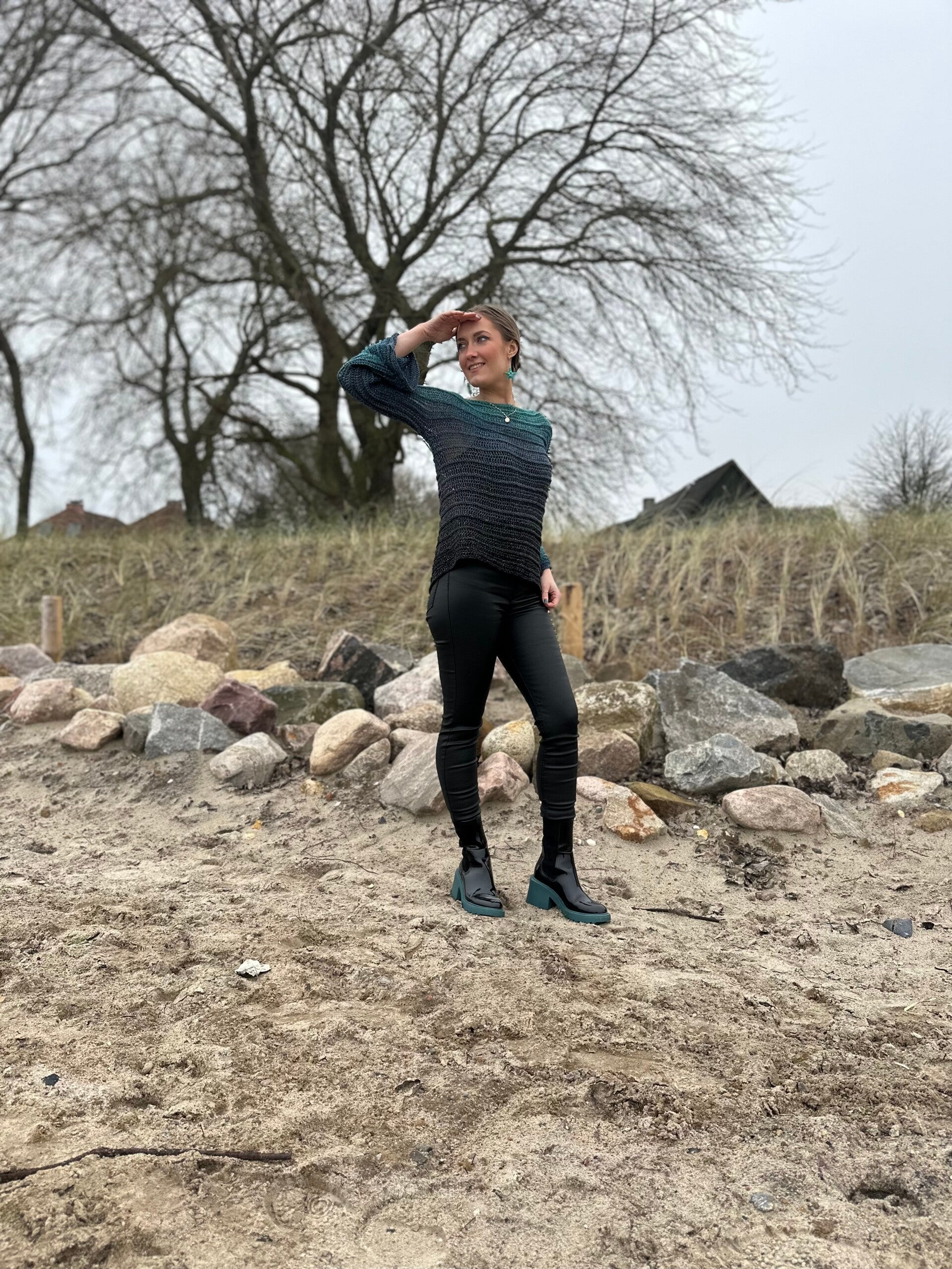 In dieser Anleitung wurde der Bobbel „Dark Petrol ultrasoft deluxe“ (3fädig + Glitzer, 1000m) und "Rømø" (4fädig, 1200m)von Nähkästchen und Meer/ WUNDERZAUBERWOLLE verwendet (Größe 36/ 38).