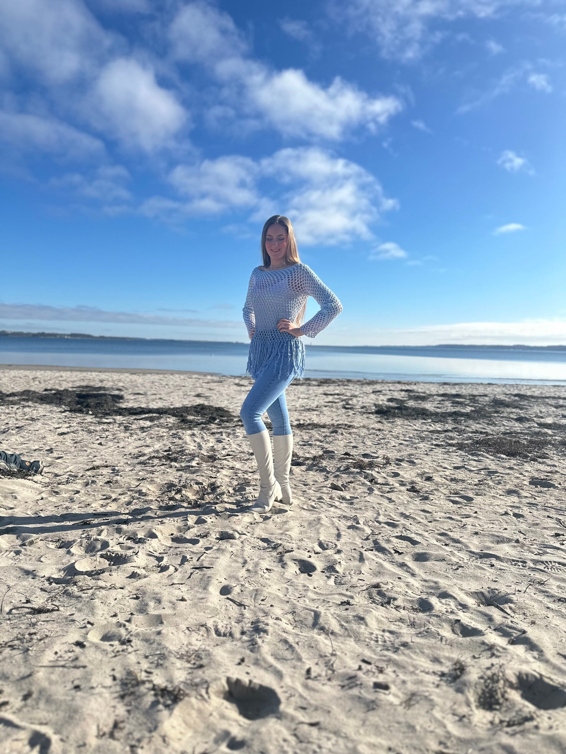 Der schöne Pulli ist an jede Größe anpassbar und für nahezu jedes Garn geeignet. Man kann ihn natürlich auch ohne Fransen arbeiten.