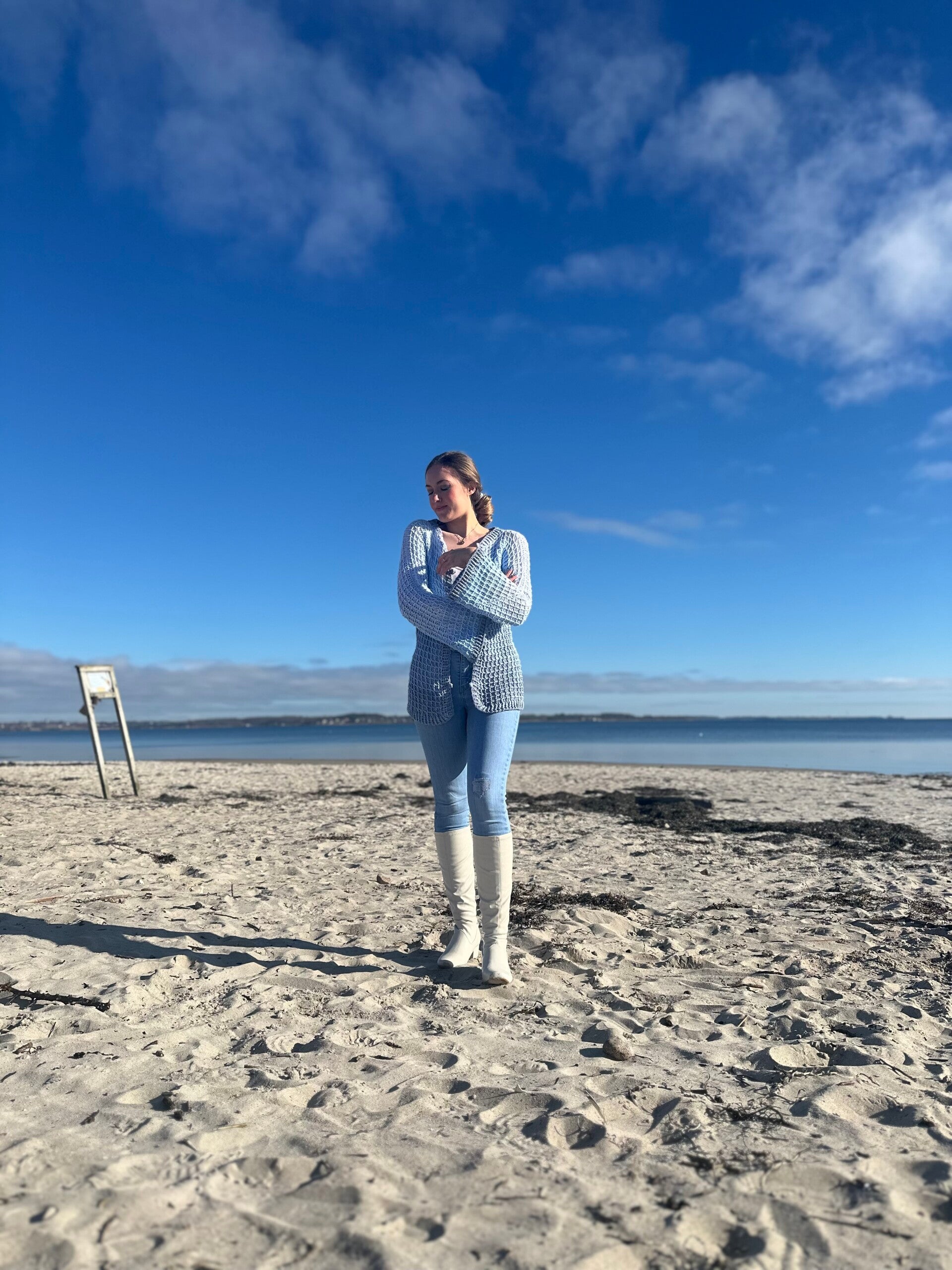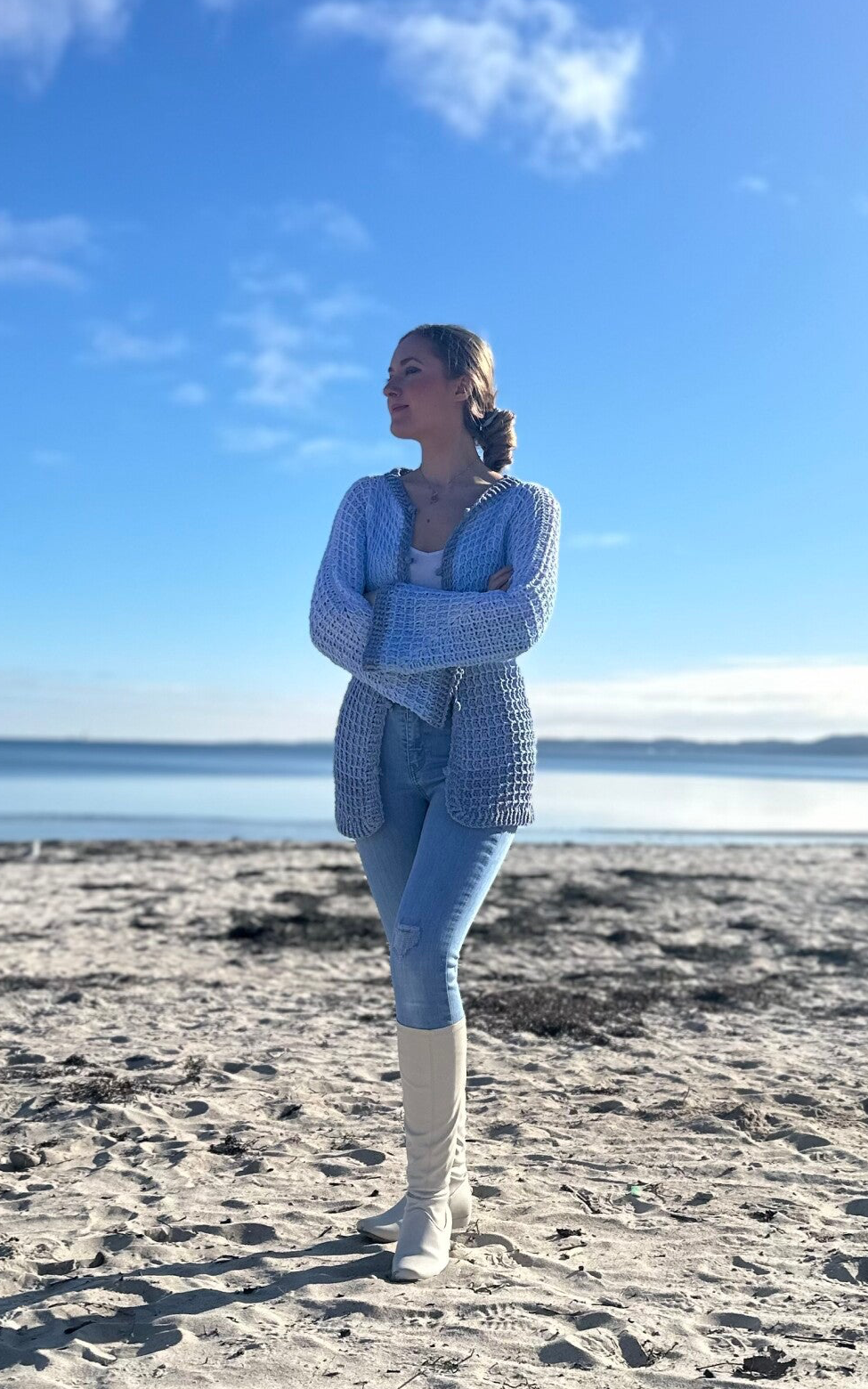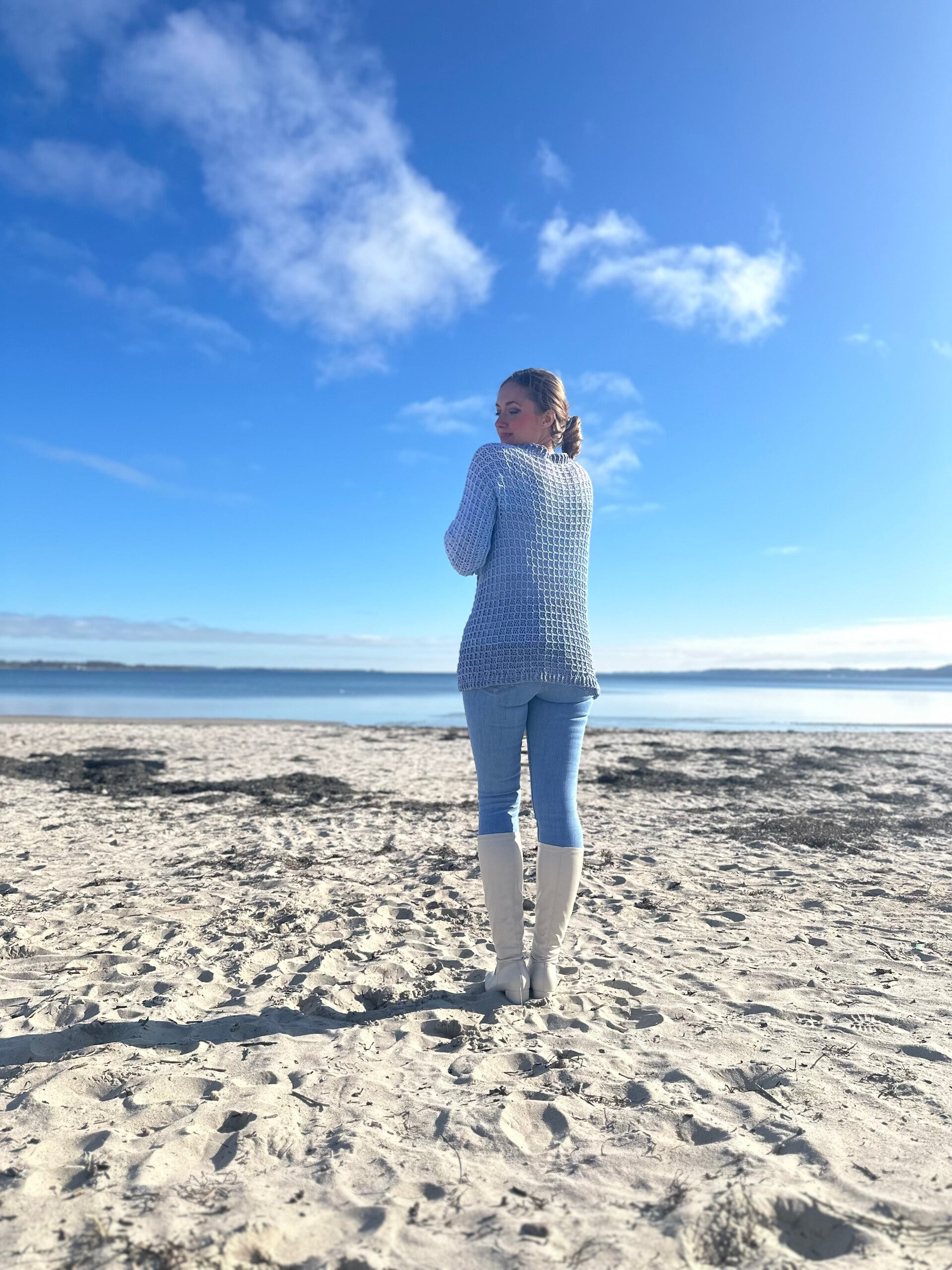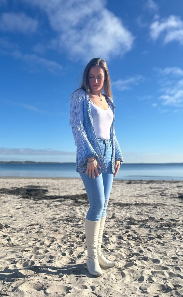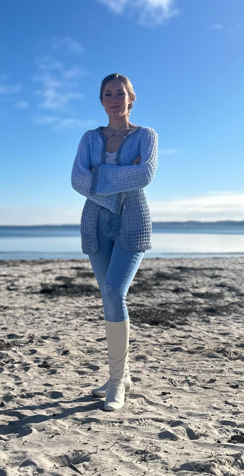 Je nach Garnauswahl, kann man die Jacke sowohl im Winter als auch im Sommer tragen. Besonders gut eignen sich hier Farbverlaufsgarne/ Bobbel, weil sie mit einem Rutsch von der Häkelnadel hüpft.